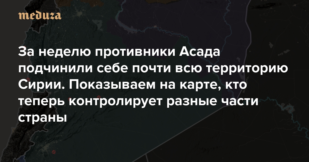 Примечание: на карте справа могут быть отражены все описанные в тексте изменения в контроле территорий. Ситуация находится в динамике, «Медуза» продолжает следить за событиями, и после стабилизации обстановки в разных частях Сирии в карту могут быть внесены коррективы.