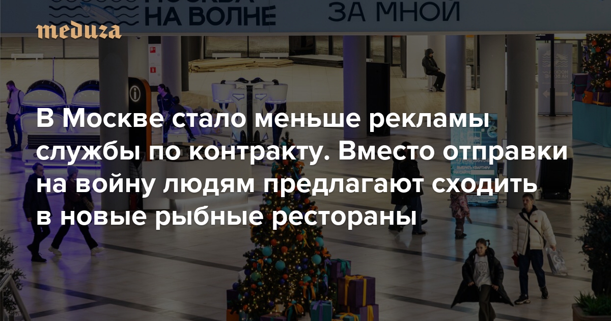 Два собеседника «Медузы», близких к администрации президента (АП) РФ, пояснили, что военную агитацию заменяют «привычной для Москвы социальной рекламой». На центральных улицах города рекламу контрактной службы ближе к концу 2024 года сменили предложения посетить «новые рыбные места» столицы — в первую очередь рестораны, — а также новогодние баннеры.