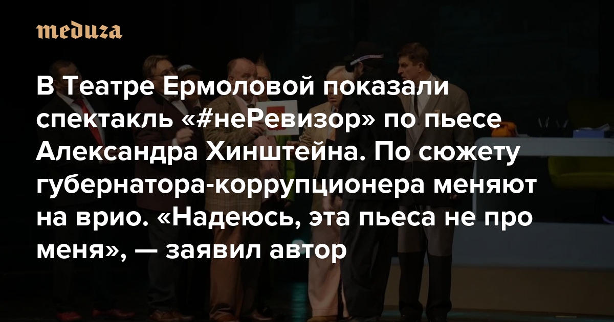 В Театре Ермоловой показали спектакль «#неРевизор» по пьесе Александра Хинштейна (его совсем недавно назначили главой Курской области) По сюжету губернатора-коррупционера меняют на врио. «Надеюсь, эта пьеса не про меня», — заявил автор