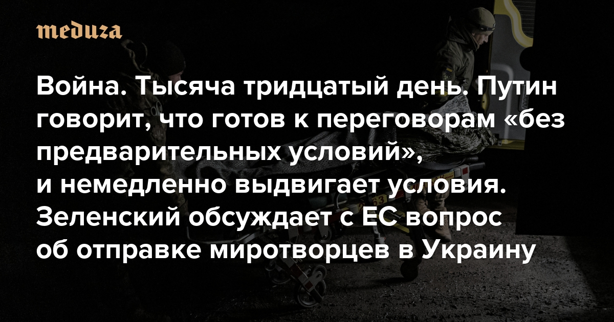 Война Тысяча тридцатый день. Путин говорит, что готов к переговорам «без предварительных условий», и немедленно выдвигает условия. Зеленский обсуждает с ЕС вопрос об отправке миротворцев в Украину