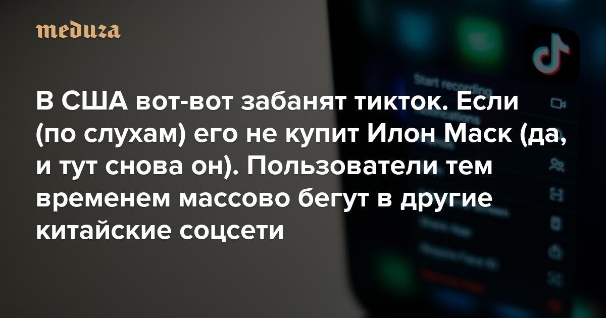 Новым владельцем TikTok в США может стать Илон Маск. Журналисты Bloomberg выяснили, что это одна из опций, которые рассматривают китайские власти. Такой вариант позволит избежать блокировки соцсети на территории страны, которая может произойти уже в конце этой недели. Пока апелляцию TikTok рассматривает Верховный суд США, а пользователи ищут замену сервису, в том числе среди китайских аналогов. «Медуза» рассказывает, что происходит вокруг TikTok за четыре дня до возможного бана.
