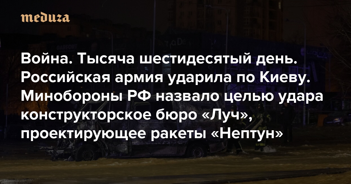 Война Тысяча шестидесятый день. Российская армия ударила баллистической ракетой по Киеву. Минобороны РФ назвало целью удара конструкторское бюро «Луч», проектирующее ракеты «Нептун»