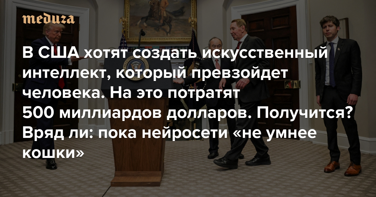 На следующий день после вступления в должность президента США Дональд Трамп объявил о создании новой компании Stargate, которая займется развитием искусственного интеллекта. Предполагается, что это будет крупнейший ИИ-проект в истории — в ближайшие четыре года ключевые инвесторы планируют вложить в него 500 миллиардов долларов. Глава OpenAI Сэм Альтман уже заявил, что благодаря Stargate в США наконец-то будет разработан общий искусственный интеллект (AGI), о создании которого мечтают все компании в этой индустрии. Правда, далеко не все разделяют его уверенность, а Илон Маск и вовсе раскритиковал эту инициативу. «Медуза» рассказывает, что такое общий ИИ — и почему Stargate вряд ли сможет его создать (но, возможно, приблизит его появление).