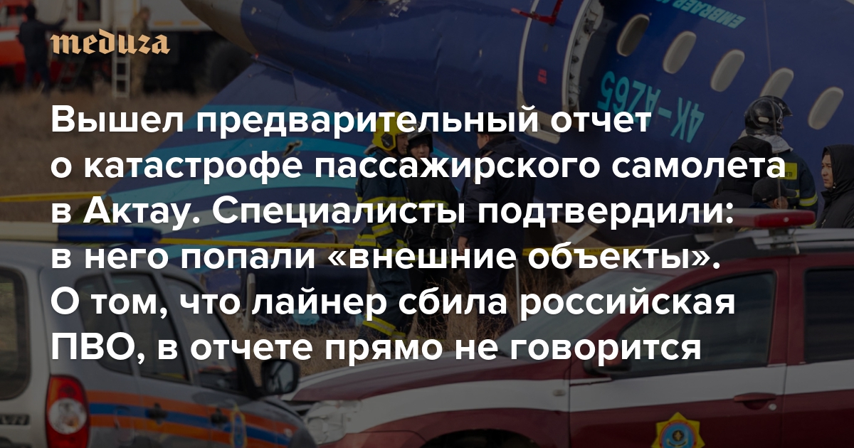Вышел предварительный отчет о катастрофе пассажирского самолета в Актау. Специалисты подтвердили: в него попали «внешние объекты» О том, что лайнер сбила российская ПВО, в отчете прямо не говорится