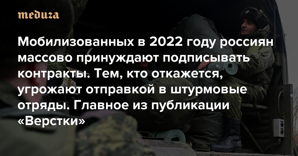 Мобилизованных в 2022 году россиян массово принуждают подписывать контракты. Тем, кто откажется, угрожают отправкой в штурмовые отряды Главное из публикации «Верстки»