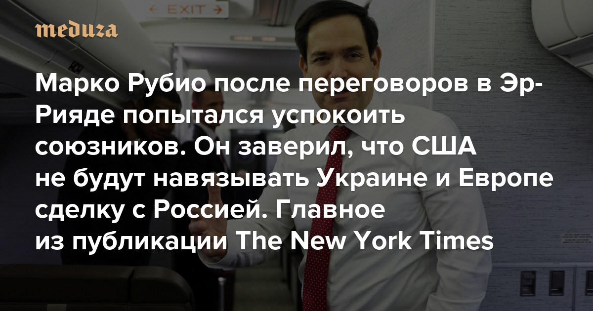 Марко Рубио после переговоров в Эр-Рияде попытался успокоить союзников. Он заверил, что США не будут навязывать Украине и Европе сделку с Россией Главное из публикации The New York Times