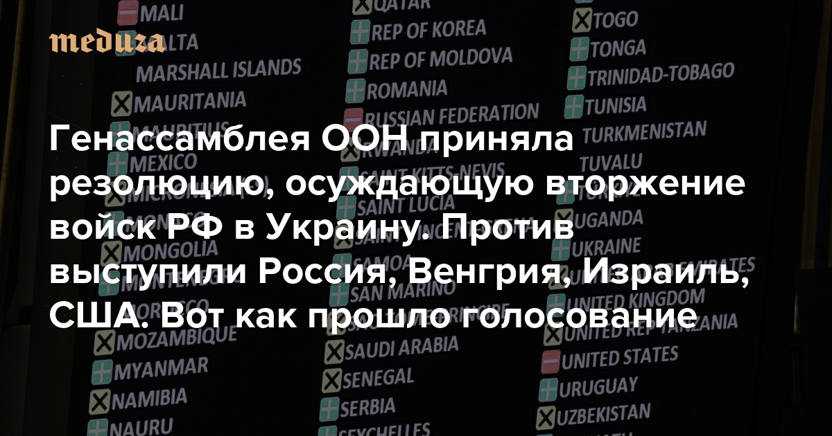 Генассамблея ООН приняла резолюцию, осуждающую вторжение войск РФ в Украину. Против выступили Россия, Венгрия, Израиль, США. Вот как прошло голосование