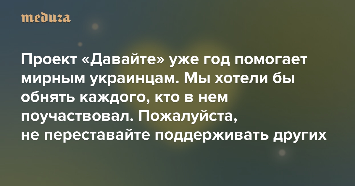 Ровно 12 месяцев назад, во вторую годовщину полномасштабного российского вторжения, мы запустили проект «Давайте». Его создатели — «Служба поддержки», «Медуза» и «Дождь». Проект собирает деньги для мирных украинцев, пострадавших от российской агрессии.