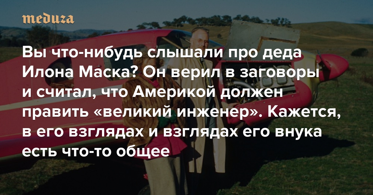 Вы что-нибудь слышали про деда Илона Маска? Он верил в заговоры и считал, что Америкой должен править «великий инженер» Кажется, в его взглядах и взглядах его внука есть что-то общее