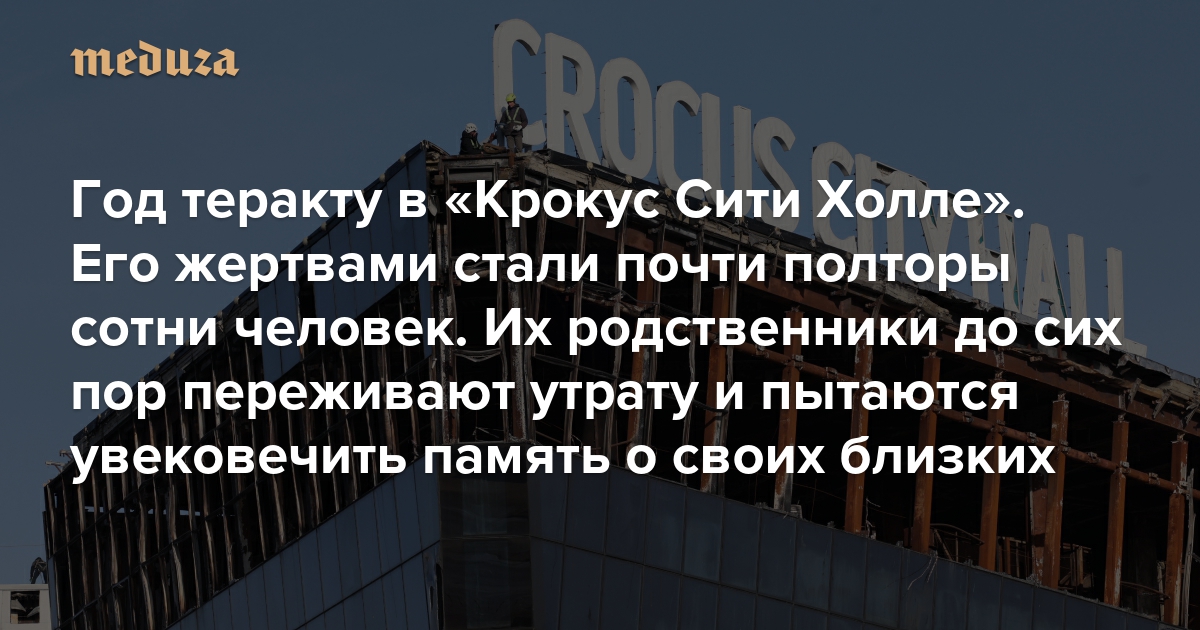 Год назад, 22 марта 2024-го, в московский концертный зал «Крокус Сити Холл», где сотни зрителей ожидали выступления популярной группы «Пикник», ворвались вооруженные террористы. Они открыли огонь по безоружным людям, а затем устроили пожар, быстро охвативший все здание. От пуль, огня и дыма погибли 145 человек, еще более пятисот пострадали. За прошедший год официальные органы так и не прояснили полную картину случившегося, не назвали ответственных за провалы в охране массовых мероприятий и технике противопожарной безопасности — и даже не смогли идентифицировать останки всех жертв теракта. Родственники погибших вынуждены самостоятельно справляться с горем и искать способы увековечить память своих близких. Журналисты из кооператива «Берег» поговорили с некоторыми из них. «Медуза» публикует этот репортаж полностью.