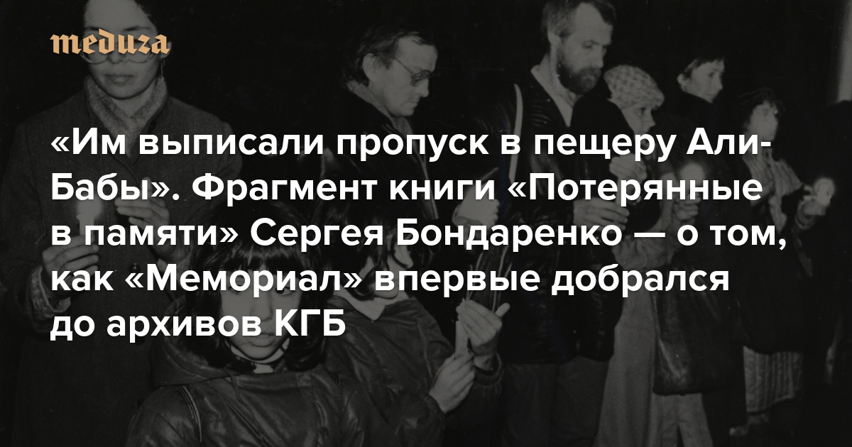В издательстве Ricochet при участии фонда StraightForward Foundation вышла книга сценариста и историка Сергея Бондаренко «Потерянные в памяти: общество „Мемориал“ и борьба за прошлое в России». Автор сам работал в «Мемориале» — в своей книге он рассказывает историю этой организации, ликвидированной в России и получившей в то же время Нобелевскую премию мира. С разрешения издательства «Медуза» публикует главу о том, как активисты организации впервые получили доступ к архивам КГБ — и почему это стало большим событием.