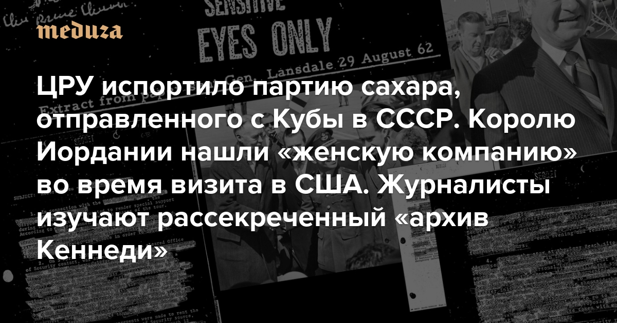 ЦРУ испортило партию сахара, отправленного с Кубы в СССР. Королю Иордании нашли «женскую компанию» во время визита в США Журналисты изучают рассекреченный «архив Кеннеди». Пока что нашлось вот такое