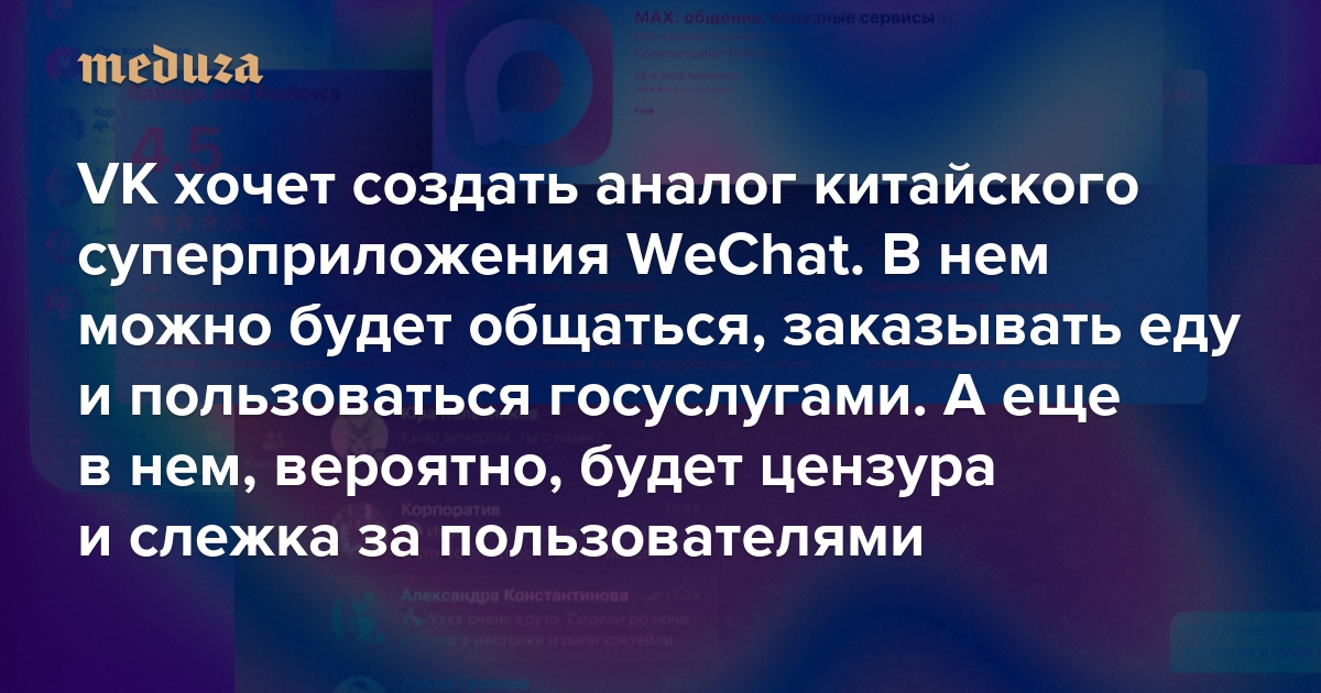 VK хочет создать аналог китайского суперприложения WeChat. В нем можно будет общаться, заказывать еду и пользоваться госуслугами Звучит неплохо, вот только, скорее всего, нас ждет цензура и слежка за пользователями