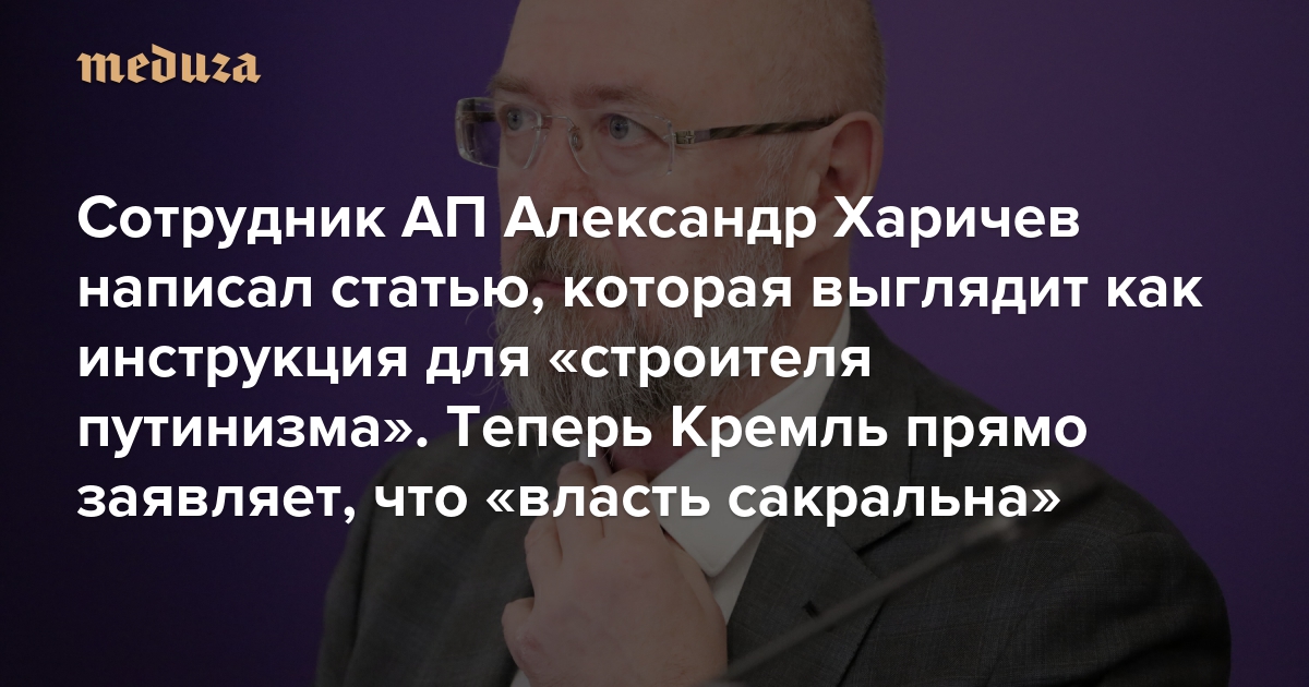 В журнале «Блокнот гражданского просвещения» вышла программная статья Александра Харичева — руководителя «идеологического» управления администрации президента (АП) по мониторингу социальных процессов. В ней один из ключевых сотрудников Кремля рассуждает о «развитии российской цивилизации» и о том, что «движет россиянами». В материале, который выглядит как инструкция для «строителя путинизма», есть важная новация: впервые Кремль от первого лица заявляет, что власть в России «сакральна». Спецкор «Медузы» Андрей Перцев пересказывает статью Харичева и объясняет, зачем он ее написал.