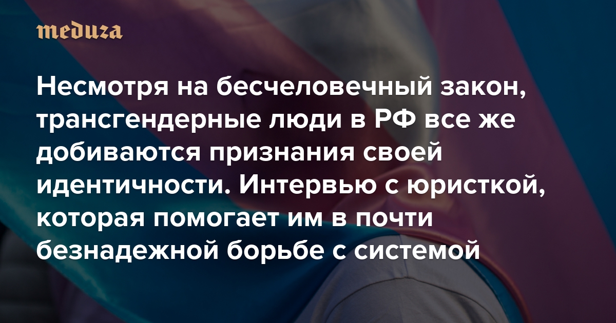 «Суды много положительных решений выносят. 15 смелых судей — это очень круто» Несмотря ни на что, трансгендерные люди в РФ добиваются признания своей идентичности. Вот рассказ юристки, которая помогает им в почти безнадежной борьбе с системой