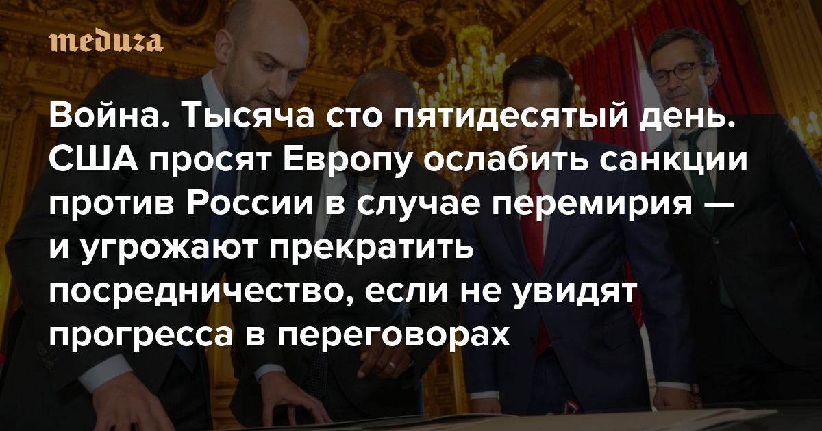 Война Тысяча сто пятидесятый день. США просят Европу ослабить санкции против России в случае перемирия — и угрожают прекратить посредничество, если не увидят прогресса в переговорах в ближайшие дни