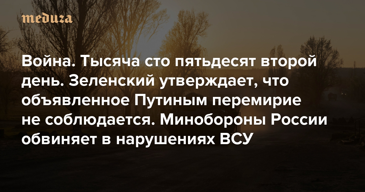 Война Тысяча сто пятьдесят второй день. Зеленский утверждает, что объявленное Путиным перемирие не соблюдается. Минобороны России обвиняет в нарушениях ВСУ