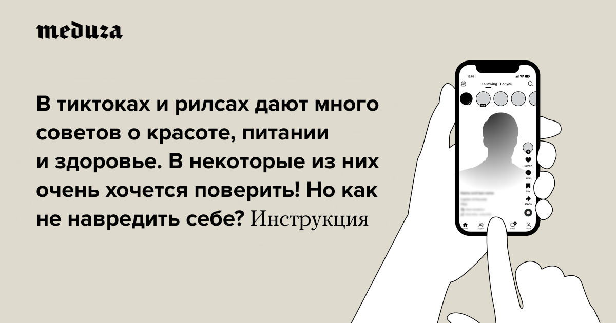 Короткие видео в тиктоке, инстаграме и ютьюбе — важный феномен, который влияет на наши вкусы, увлечения и принимаемые решения почти во всех сферах жизни. В том числе в вопросах питания, красоты и здоровья. Далеко не всегда такой информации можно доверять: нередко оказывается, что популярные рекомендации неточны или даже вредны. Реальность гораздо сложнее, чем рассказывают инфлюенсеры. В этой инструкции кооператив независимых журналистов «Берег» рассказывает, как защитить себя от опасной или недостоверной информации. «Медуза» публикует этот текст с небольшими дополнениями. А еще мы подготовили тест, который поможет вам понять, насколько хорошо вы с ходу можете отличить некорректное утверждение о здоровье от верного.