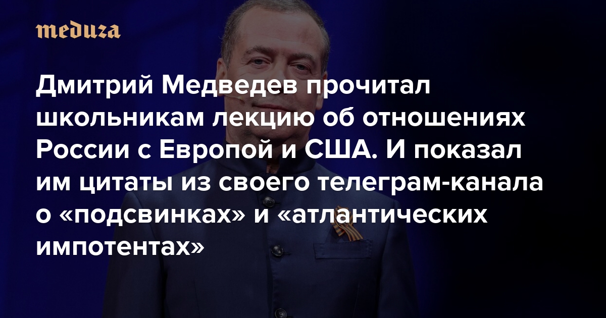 Дмитрий Медведев прочитал школьникам лекцию об отношениях России с Европой и США И показал им цитаты из своего телеграм-канала о «подсвинках» и «атлантических импотентах»