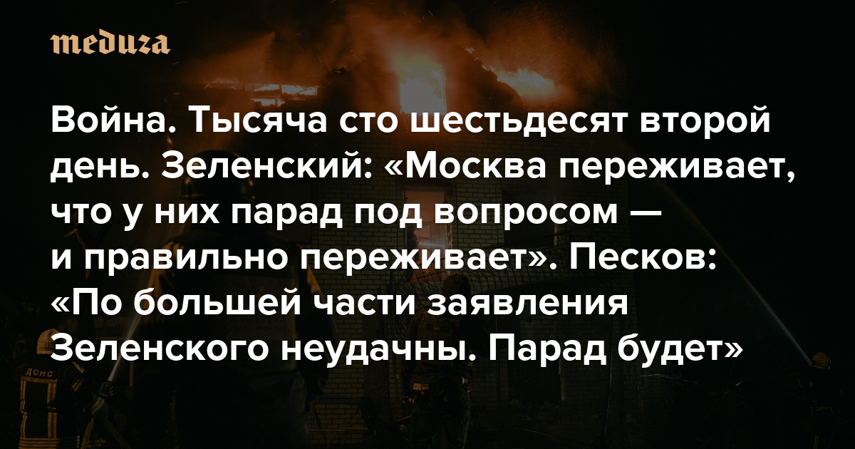 Война Тысяча сто шестьдесят второй день. Зеленский: «Москва переживает, что у них парад под вопросом — и правильно переживает». Песков: «По большей части заявления Зеленского неудачны. Парад будет»