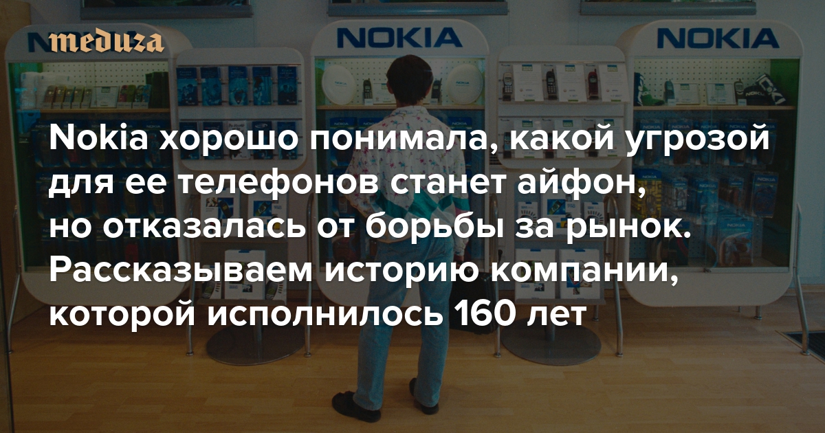 В мае компании Nokia исполнилось 160 лет. Одна из самых известных в мире корпораций начинала с производства бумаги и автомобильных шин, а в конце XX века стала лидером в индустрии мобильной связи. Со временем успех сменился провалом — принято считать, что Nokia не выдержала конкуренции с айфоном, недооценив своего противника. Однако в начале 2025-го в интернет утекла внутренняя презентация компании, которая доказывает обратное: лидер рынка прекрасно осознавал угрозу, но решил отказаться от борьбы. «Медуза» рассказывает, почему компания так поступила и какой непростой путь проделала за эти 160 лет.