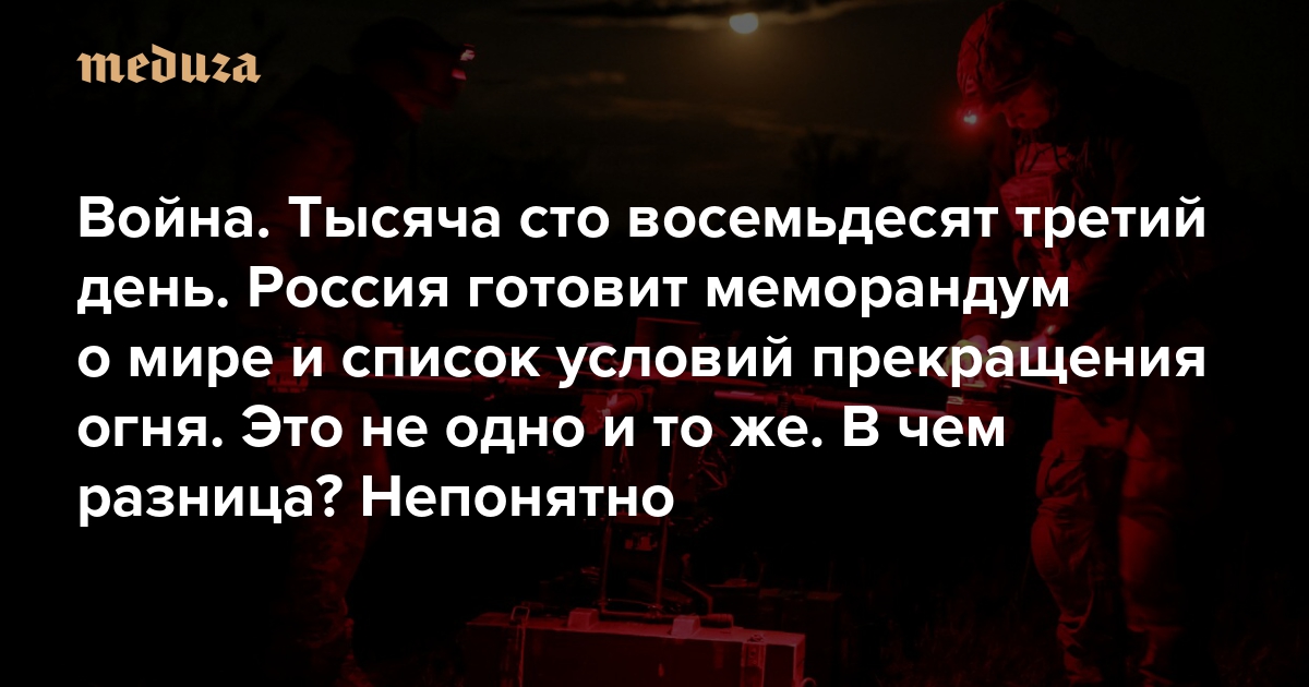 Война Тысяча сто восемьдесят третий день. Россия готовит меморандум о мире и список условий прекращения огня. Это не одно и то же. В чем разница? Непонятно