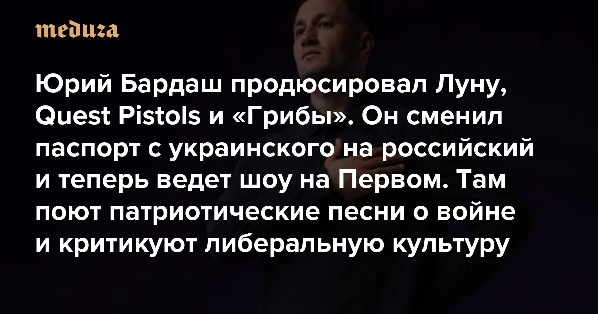 Юрий Бардаш продюсировал Луну, Quest Pistols и «Грибы». Он сменил паспорт с украинского на российский и теперь ведет шоу на Первом Там поют патриотические песни о войне и критикуют либеральную культуру