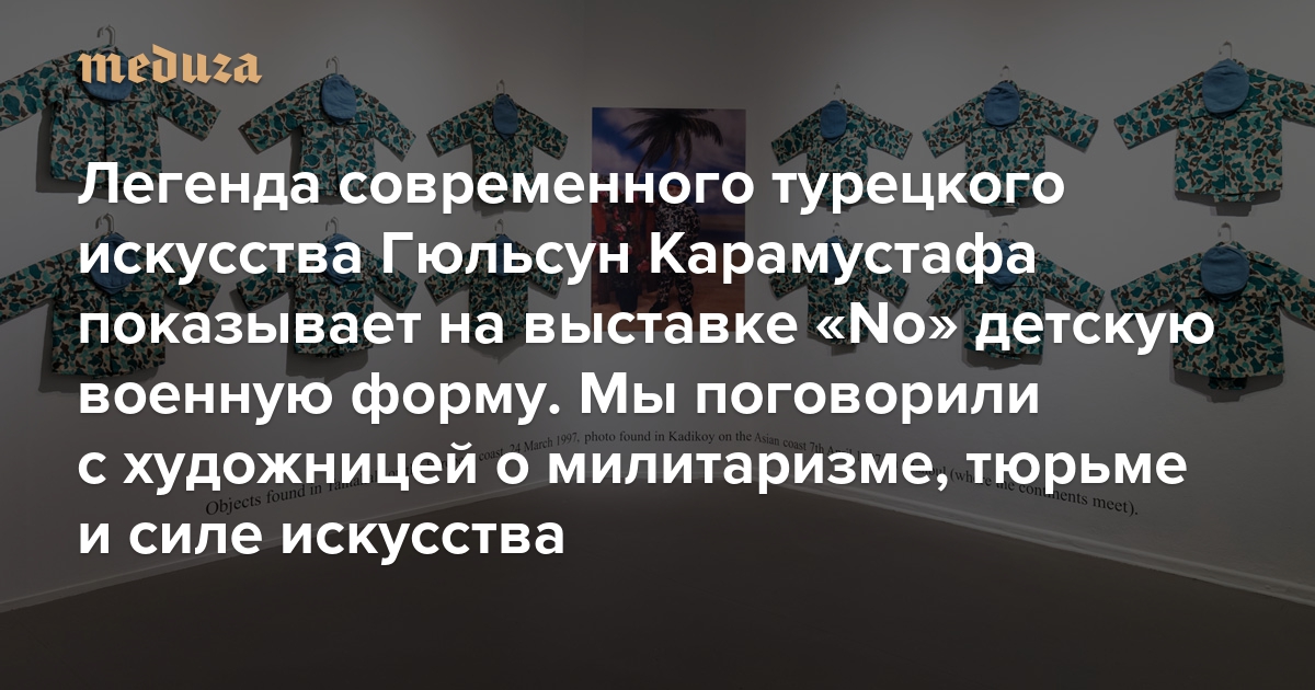На выставке «No», которую «Медуза» проводит в Kunstraum Kreuzberg/Bethanien в Берлине, Карамустафа показывает инсталляцию «Там, где встречаются континенты». Ее главный компонент — военная форма для детей: в Турции, как и в России, есть традиция на праздники одевать детей в солдат. Критик Антон Хитров (он же редактор «Медузы» и текстов для выставки «No») расспросил художницу о турецком милитаризме, тюремном заключении и работе на Венецианской биеннале.