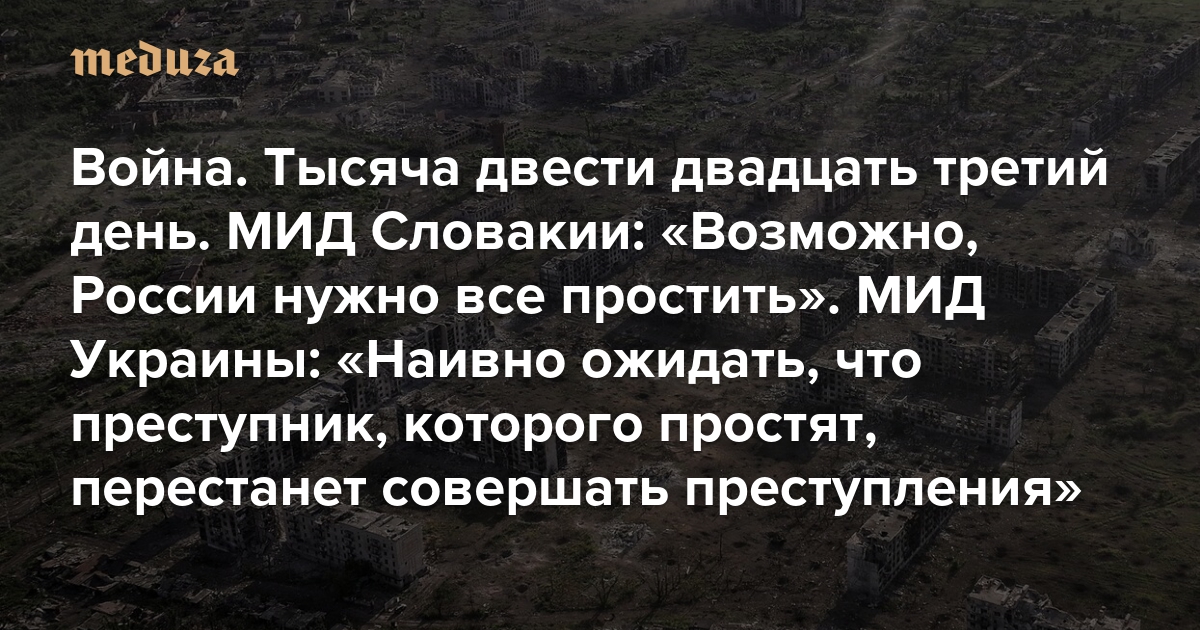 Война Тысяча двести двадцать третий день. МИД Словакии: «Возможно, России нужно все простить». МИД Украины: «Наивно ожидать, что преступник, которого простят, перестанет совершать преступления»