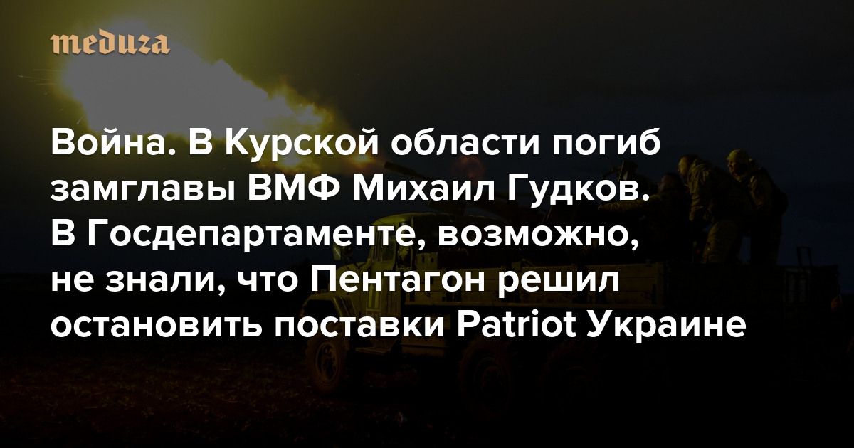 Война Тысяча двести двадцать шестой день. В Курской области погиб замглавы ВМФ Михаил Гудков. В Госдепартаменте, возможно, не знали, что Пентагон решил остановить поставки Patriot Украине