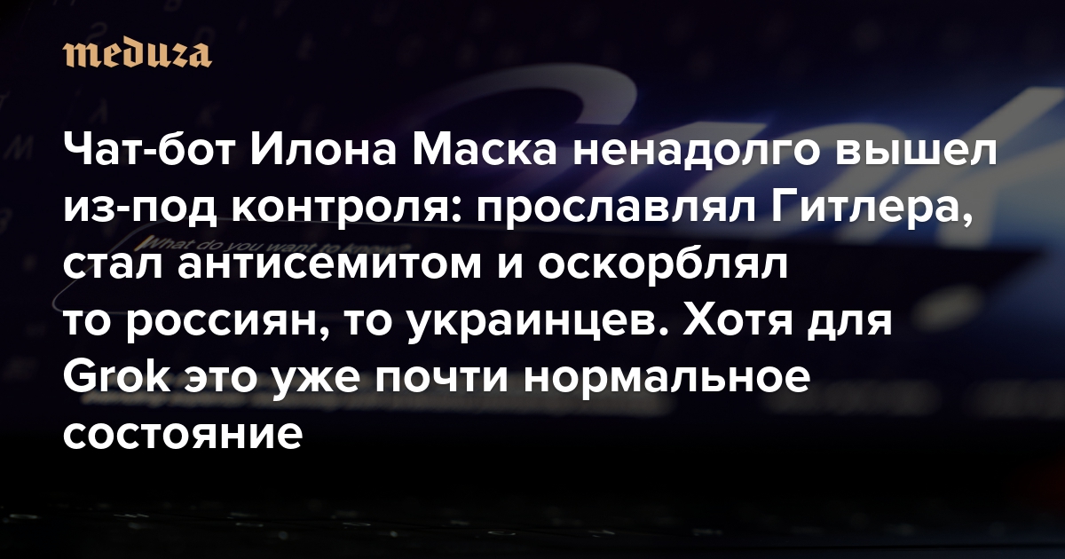 В начале июля чат-бот Grok, созданный компанией Илона Маска xAI, вышел из-под контроля. В его ответах появились антисемитские утверждения, а в какой-то момент нейросеть и вовсе признала себя МехаГитлером. В то же время в русскоязычном сегменте соцсети икс чат-бот развязал настоящую информационную войну с пользователями, которые поддерживают вторжение в Украину. В результате разработчикам пришлось удалить часть ответов, а также спешно анонсировать обновленную версию нейросети. «Медуза» рассказывает, что именно успел наговорить Grok, и объясняет, почему в случае с этим чат-ботом в подобных ответах нет ничего удивительного.