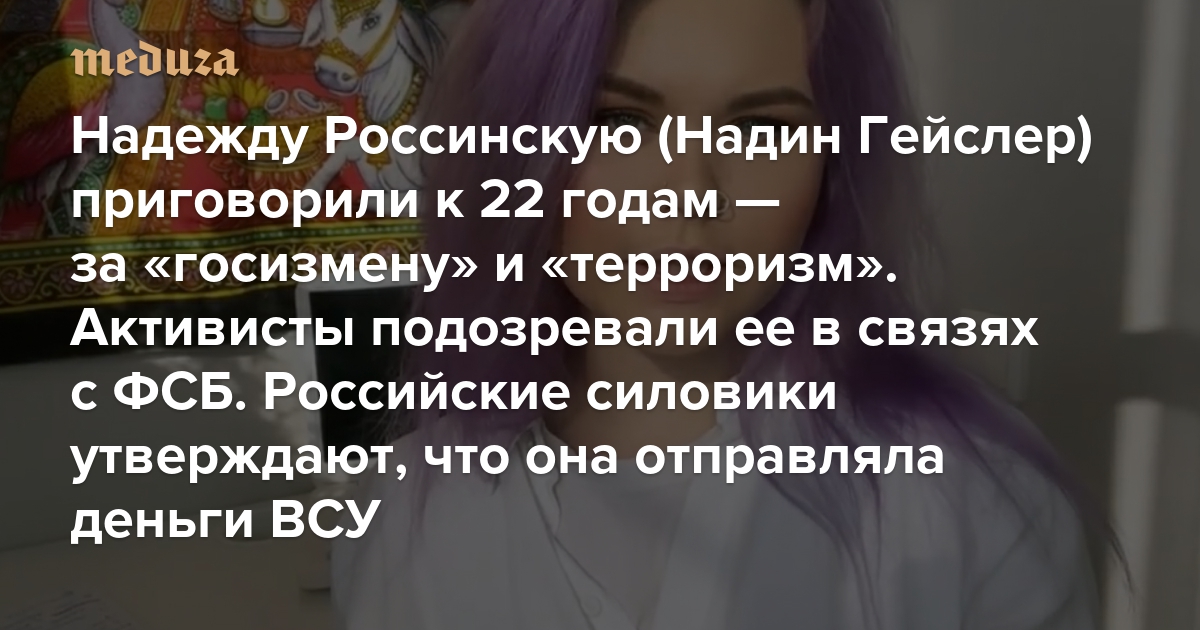 Белгородку Надежду Россинскую (Надин Гейслер) приговорили к 22 годам — за «госизмену» и «терроризм» Активисты подозревали ее в связях с ФСБ. Российские силовики утверждают, что она отправляла деньги ВСУ