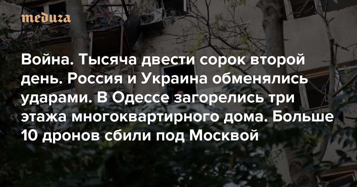 Война Тысяча двести сорок второй день. Россия и Украина обменялись ударами. В Одессе загорелись три этажа многоквартирного дома. Больше 10 дронов сбили под Москвой