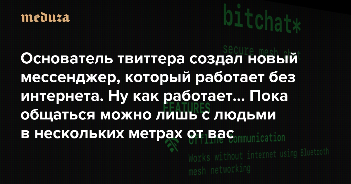 Основатель твиттера создал новый мессенджер, который работает без интернета. Ну как работает… Пока общаться можно лишь с людьми в нескольких метрах от вас