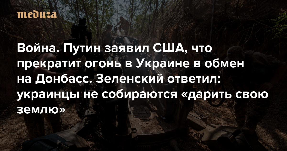 Президент РФ Владимир Путин передал администрации президента США Дональда Трампа условия прекращения огня в Украине, потребовав, чтобы Киев передал России Донбасс, сообщила 8 августа газета The Wall Street Journal, ссылаясь на европейских и украинских чиновников.