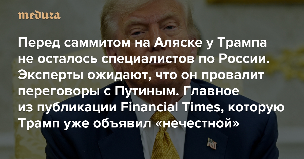 Перед саммитом на Аляске у Трампа не осталось специалистов по России. Американские эксперты ожидают, что он провалит переговоры с Путиным Главное из публикации Financial Times (которую Трамп уже объявил «нечестной»)