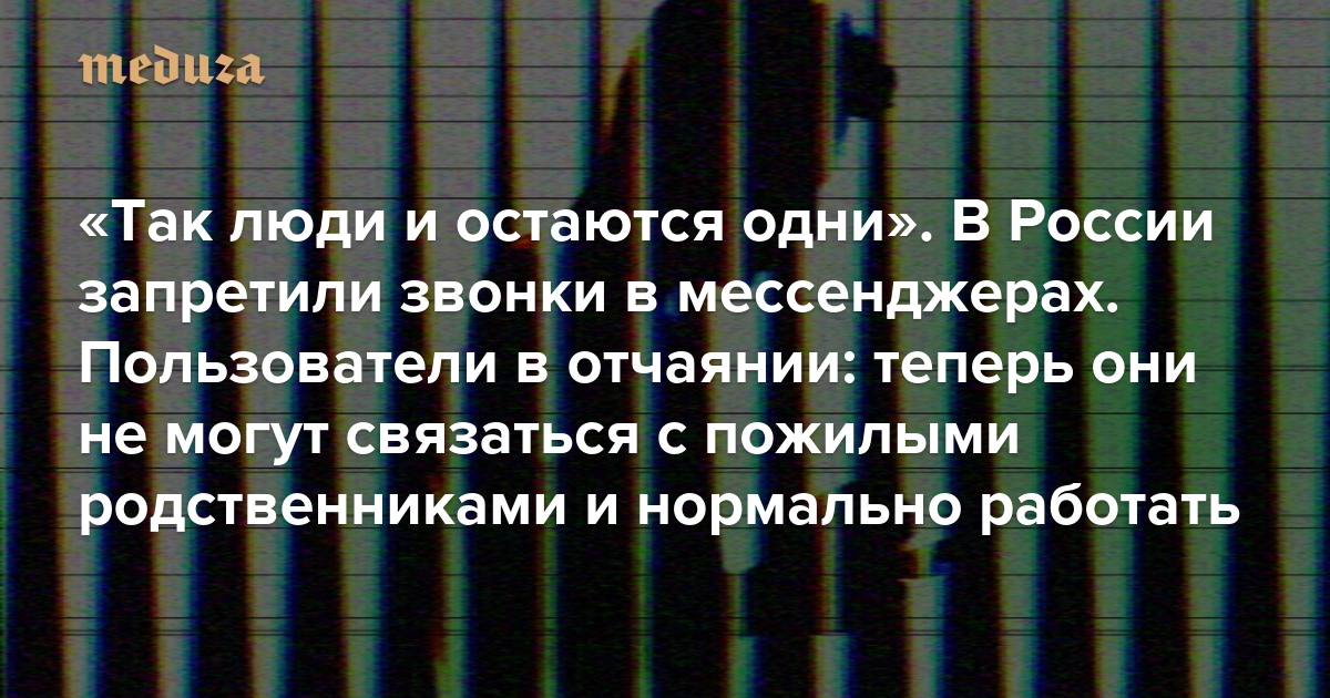 Роскомнадзор заблокировал звонки в телеграме и вотсапе — двух самых популярных мессенджерах в России (решение принято якобы для борьбы с мошенниками). «Медуза» попросила своих читателей рассказать, как это уже повлияло на их жизнь. Нам пришло множество ответов, полных негодования и отчаяния: для людей старшего поколения вотсап и телеграм часто были единственными доступными способами связи с родственниками в других регионах России и за границей. Кроме того, для многих звонки невероятно важны еще и для работы. В этом материале мы приводим с сокращениями десятки ответов, пришедших в редакцию. В целях безопасности мы не подписываем имена читателей, но указываем регион, откуда они нам написали.