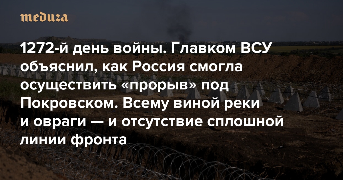 Война Тысяча двести семьдесят второй день. Главком ВСУ объяснил, как Россия смогла осуществить «прорыв» под Покровском. Всему виной реки и овраги — и отсутствие сплошной линии фронта