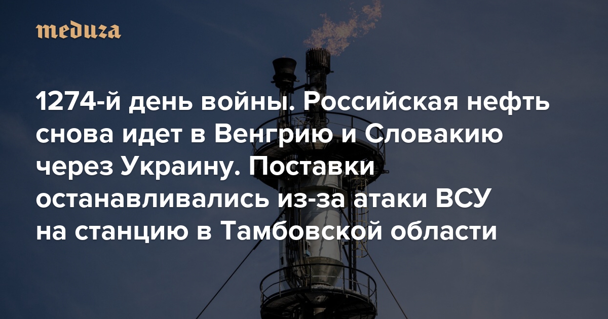 Война Тысяча двести семьдесят четвертый день. Российская нефть снова идет в Венгрию и Словакию через Украину. Поставки останавливались из-за атаки ВСУ на станцию в Тамбовской области