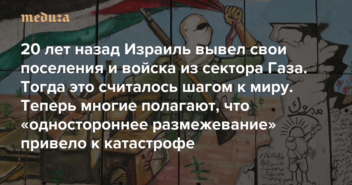 20 лет назад Израиль вывел свои поселения и войска из сектора Газа. Тогда это считалось шагом к миру. Теперь многие полагают, что «одностороннее размежевание» привело к катастрофе «Медуза» рассказывает, как те события связаны с «войной 7 октября»