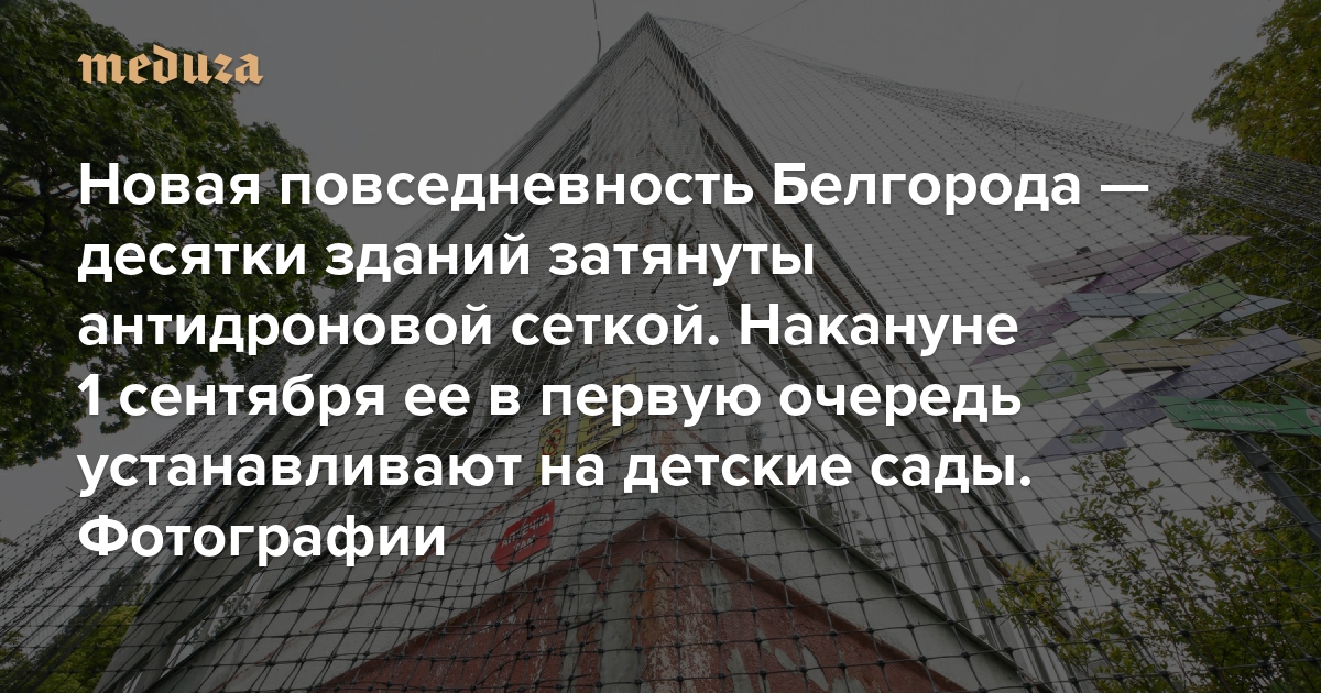 В Белгородской области для защиты от украинских беспилотников здания закрывают антидроновой сеткой. Сначала сетки устанавливали на здания (и на автомобили скорой помощи) в приграничных районах. К 1 сентября сеткой решили затянуть детские сады в Белгороде и Белгородском районе, заявил глава области Вячеслав Гладков. Всего, сообщал губернатор 24 августа, за неделю планируется закрыть сеткой 56 объектов. По словам Гладкова, закуплены 500 тысяч квадратных метров защитной сетки (это площадь примерно 70 футбольных полей), 100 тысяч квадратных метров уже начали устанавливать. При этом в приграничных районах, рассказывал он, некоторые защитные сетки на жилых домах и социальных объектах уже нужно ремонтировать или менять на новые. «Медуза» публикует фото установки сетки на детские сады в Белгороде, распространенные госагентством РИА Новости.
