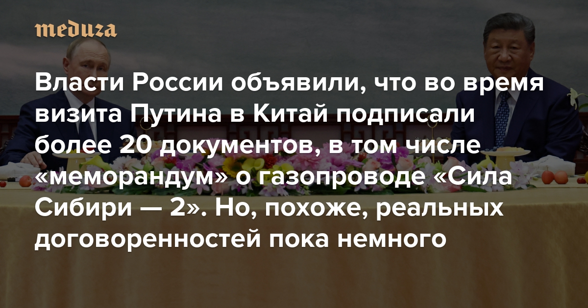 Власти России объявили, что во время визита Путина в Китай подписали более 20 документов, в том числе «меморандум» о газопроводе «Сила Сибири — 2» Но, похоже, реальных договоренностей достичь пока не удалось