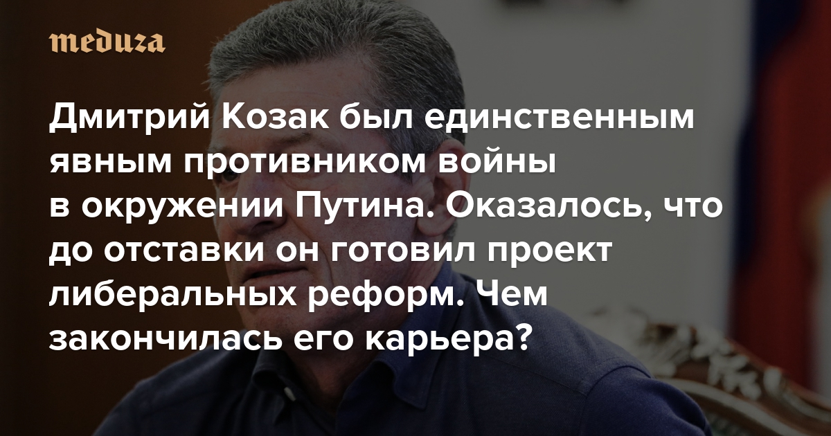 Дмитрий Козак был единственным явным противником войны в окружении Путина. Оказалось, что до отставки он готовил проект либеральных реформ Спецкор «Медузы» Андрей Перцев рассказывает, как закончилась карьера Козака