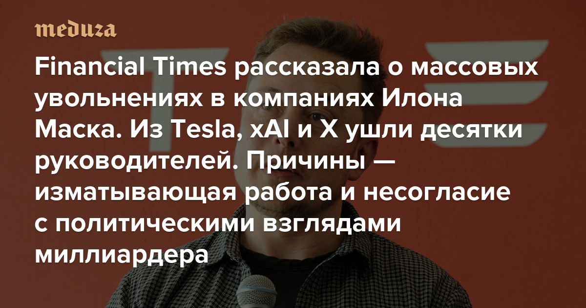 Financial Times рассказала о массовых увольнениях в компаниях Илона Маска Из Tesla, xAI и X ушли десятки руководителей. Причины — изматывающая работа и несогласие с политическими взглядами миллиардера