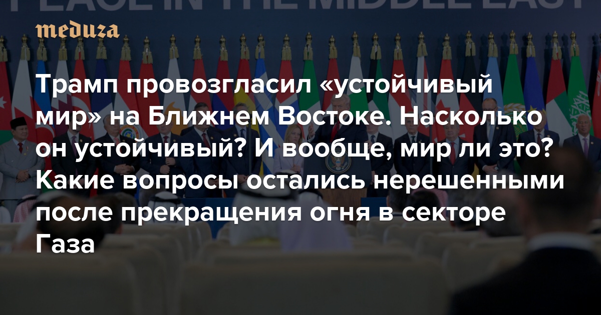 Трамп провозгласил «устойчивый мир» на Ближнем Востоке. Насколько он устойчивый? И вообще, мир ли это? Какие вопросы остались нерешенными после прекращения огня в секторе Газа