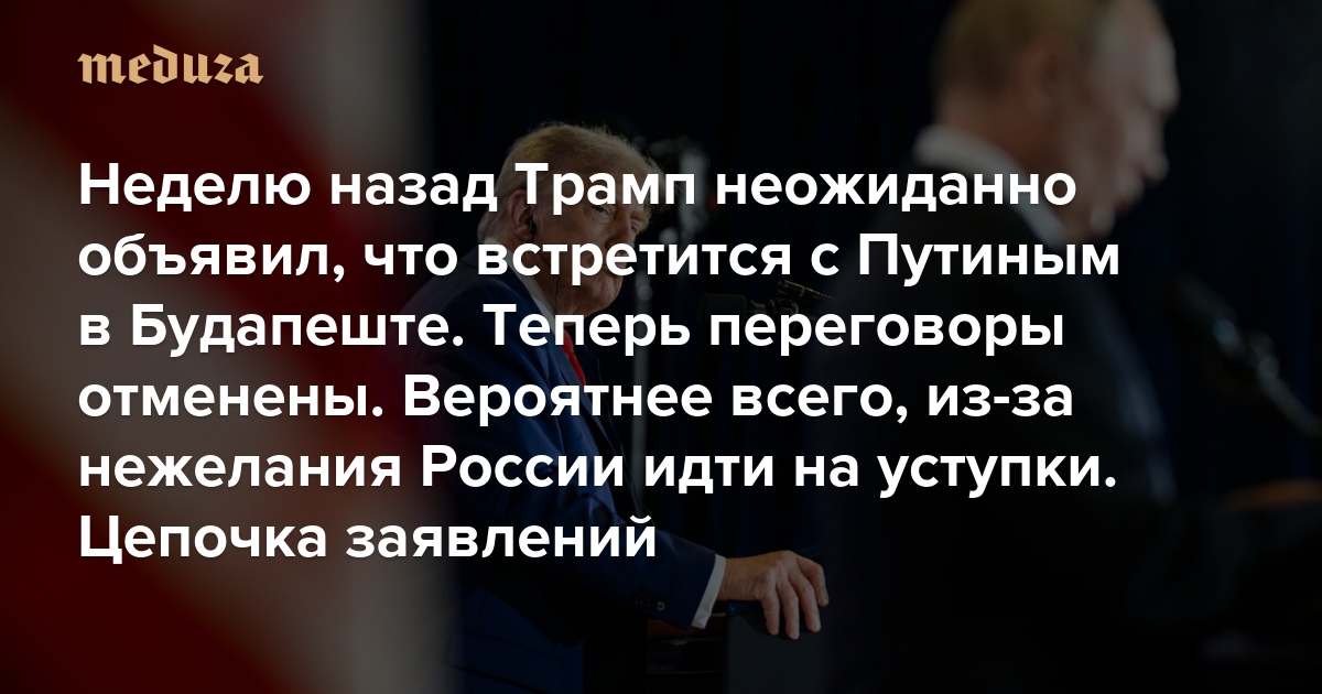 Неделю назад Трамп неожиданно объявил, что встретится с Путиным в Будапеште. Теперь переговоры отменены Вероятнее всего, из-за нежелания России идти на уступки. Цепочка заявлений