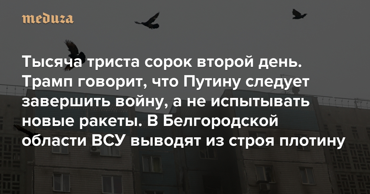 Война Тысяча триста сорок второй день. Трамп говорит, что Путину следует завершить войну, а не испытывать новые ракеты. В Белгородской области ВСУ выводят из строя плотину