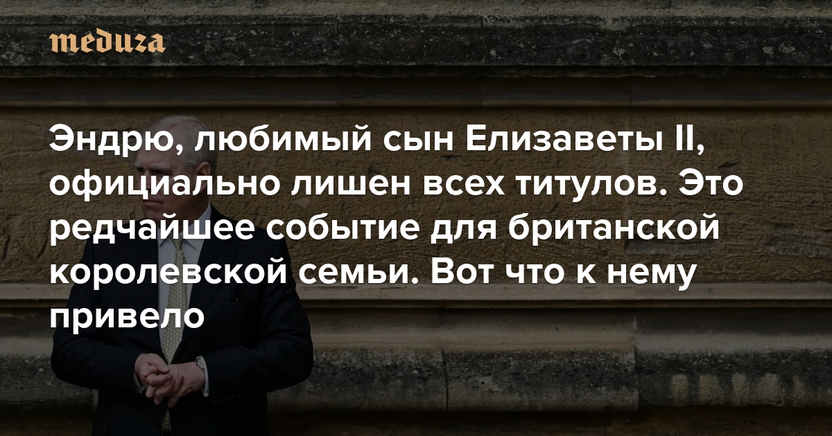 Король Карл III лишил своего младшего брата, принца Эндрю, всех титулов и приказал ему покинуть Виндзор. СМИ называют это решение беспрецедентным. Оно было принято из-за связи Эндрю с американским финансистом Джеффри Эпштейном, обвиненным в секс-торговле. Он покончил с собой в 2019 году, но и после самоубийства скандал вокруг него не затихал — и отбрасывал длинную тень на королевскую семью. «Медуза» рассказывает историю бывшего герцога Йоркского, первого за несколько поколений представителя британской монархии, потерявшего королевский статус.