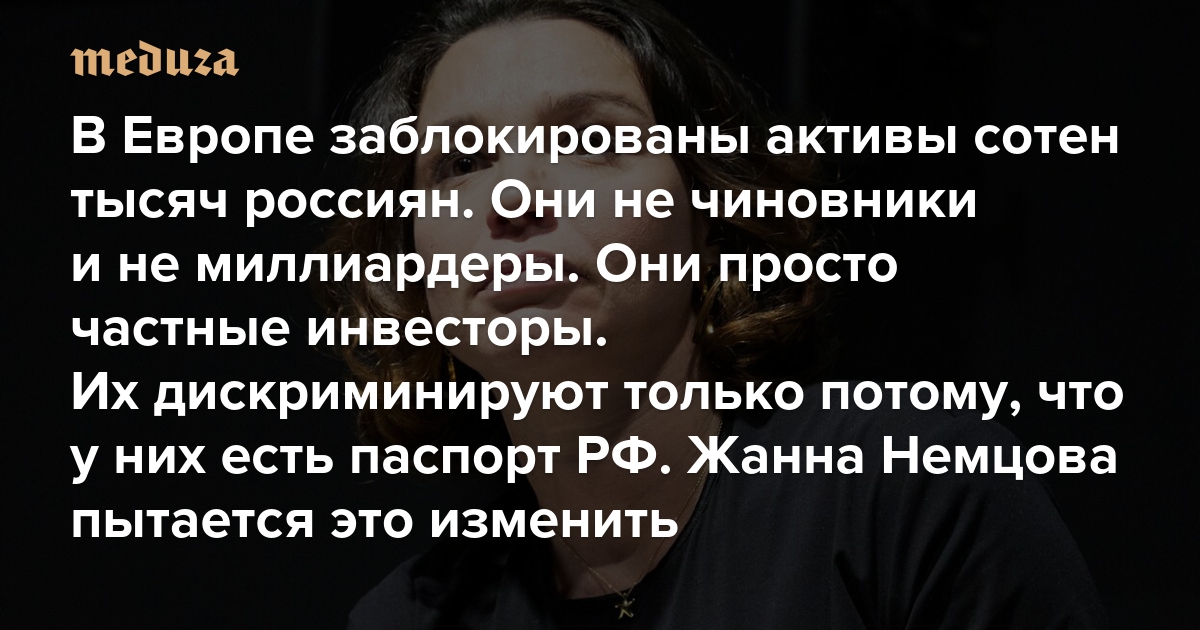 В Европе заблокированы активы сотен тысяч россиян. Они не чиновники и не миллиардеры. Они просто частные инвесторы Их дискриминируют только потому, что у них есть паспорт РФ. Жанна Немцова пытается это изменить