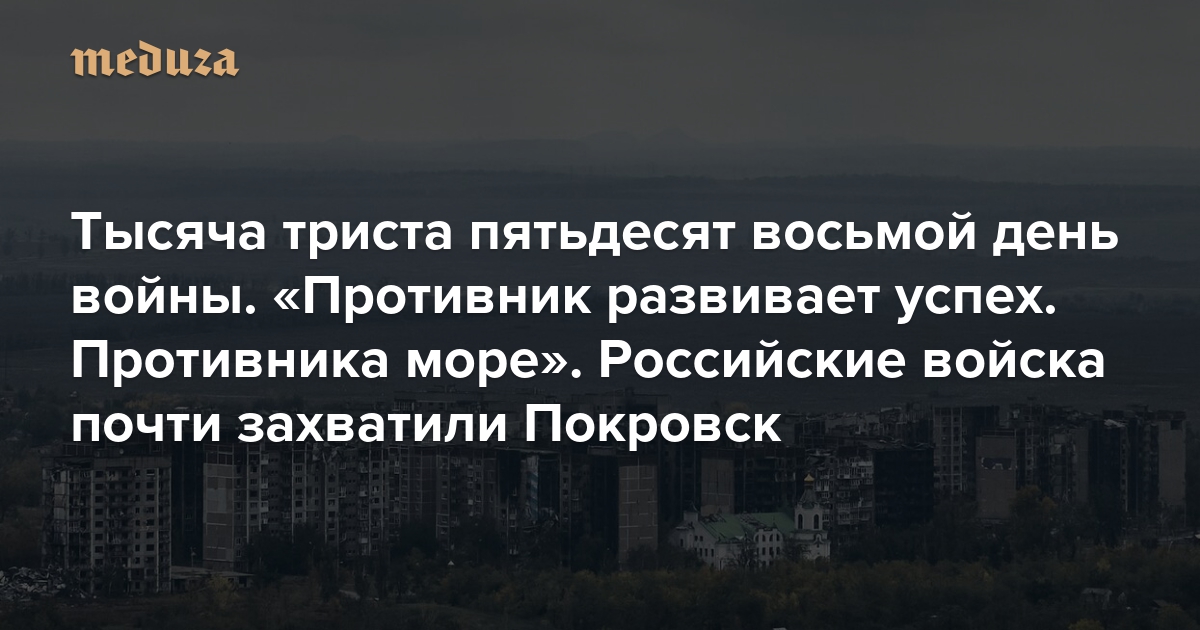 Российские войска близки к тому, чтобы установить полный контроль над Покровском, пишет «Медуза» в свежей сводке о ходе боев. В город, который находится в полуокружении, входят крупные силы. Российские военные продвигаются на мотоциклах и пикапах, они устанавливают минометы.